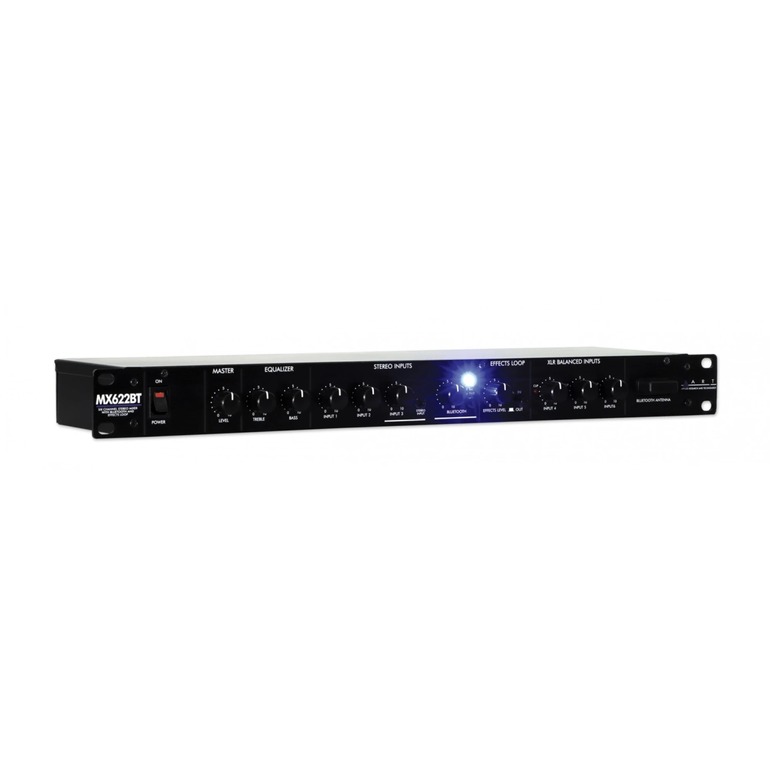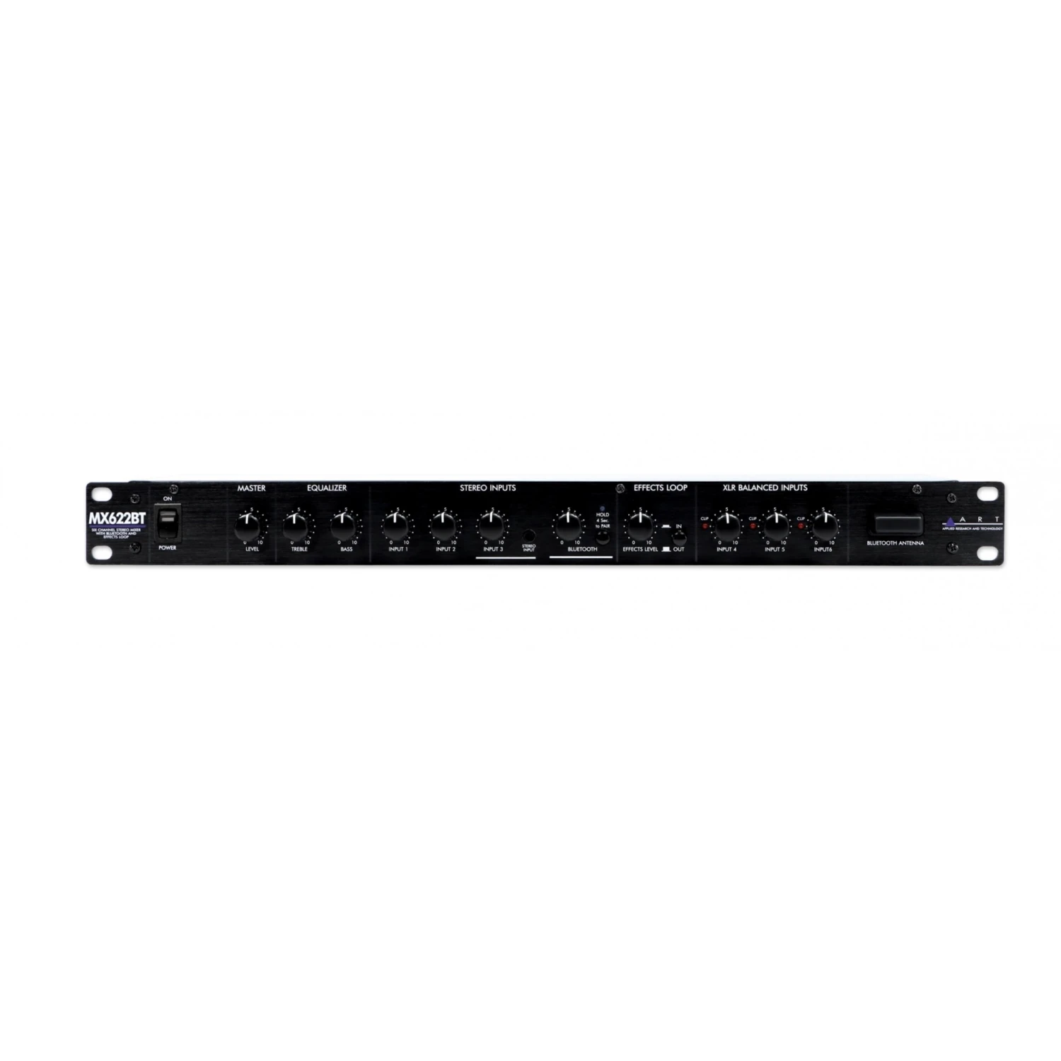The ART MX622BT Six Channel Stereo Mixer with BLUETOOTH and Effects Loop is a versatile single high rack mixer combining three balanced microphone or line level inputs with three stereo line inputs plus a stereo Bluetooth input into a single stereo line level mix. Each mono balanced XLR input includes fully variable Input gain, Mic/Line switch, Clip indicator, and selectable 15 Volt Phantom power. Three stereo line level inputs are also provided via RCA type jacks with separate Level controls for each stereo pair. The front panel also has a 1/8-inch input for portable audio device input. The Bluetooth input supports Bluetooth 5.0 and has its own level control and Pairing/ ON/OFF switch. An external effects loop section provides a mono Send from the three Mic/Line channels to external equipment and stereo Returns with Effects Level and In/Out switch. Stereo Record output RCA jacks provide full-level signal of the entire mix at all times. Main outputs are stereo balanced 1/4-inch TRS with Master Level and full range Bass/Treble equalization. The built-in power supply and single high 19-inch rack mount format allows for easy installation and reliable operation.