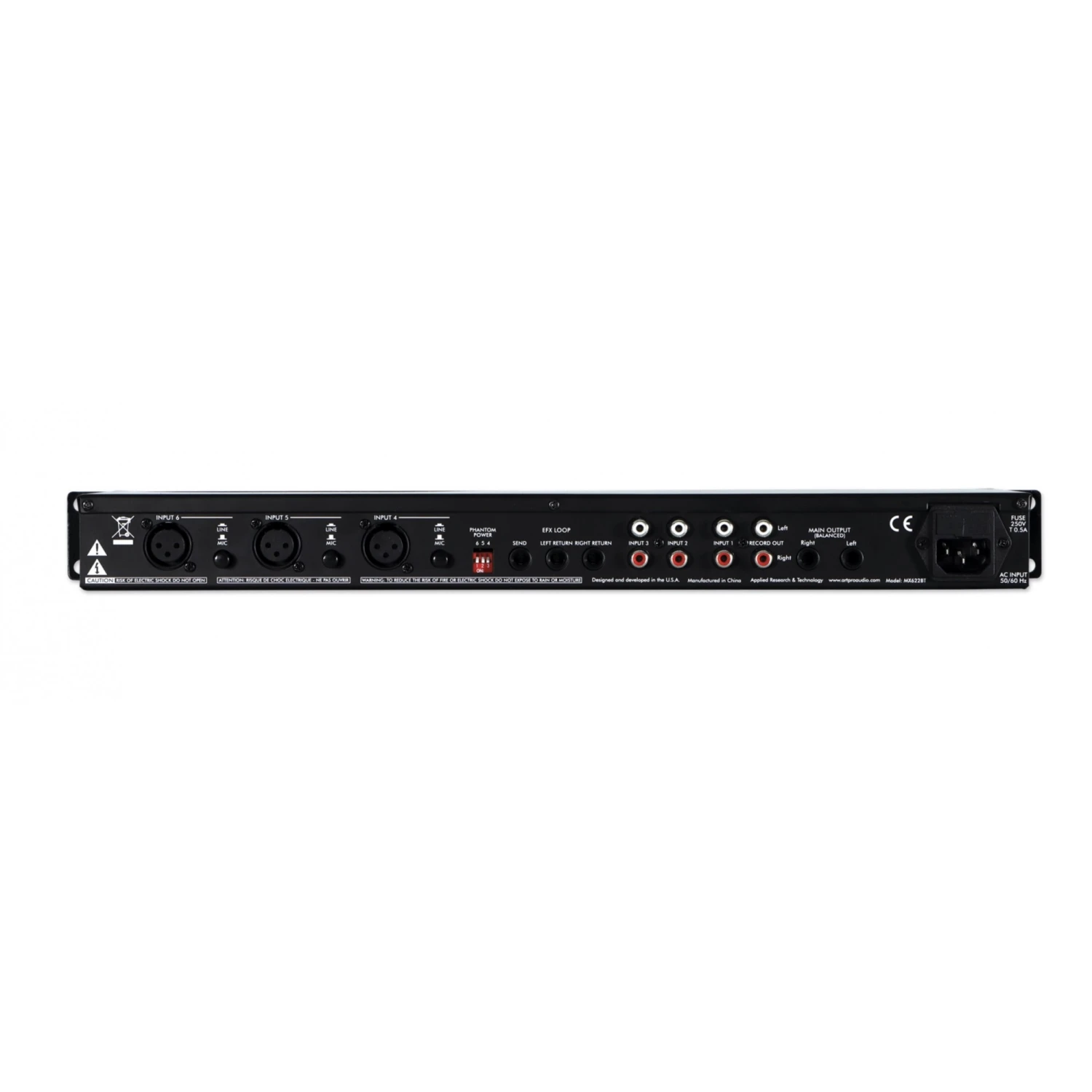 | Input Impedance | 600/22K Ohms Mic/Line XLR inputs, 10K Ohms RCA inputs, 22K Ohms, 1/4-inch EFX Returns |