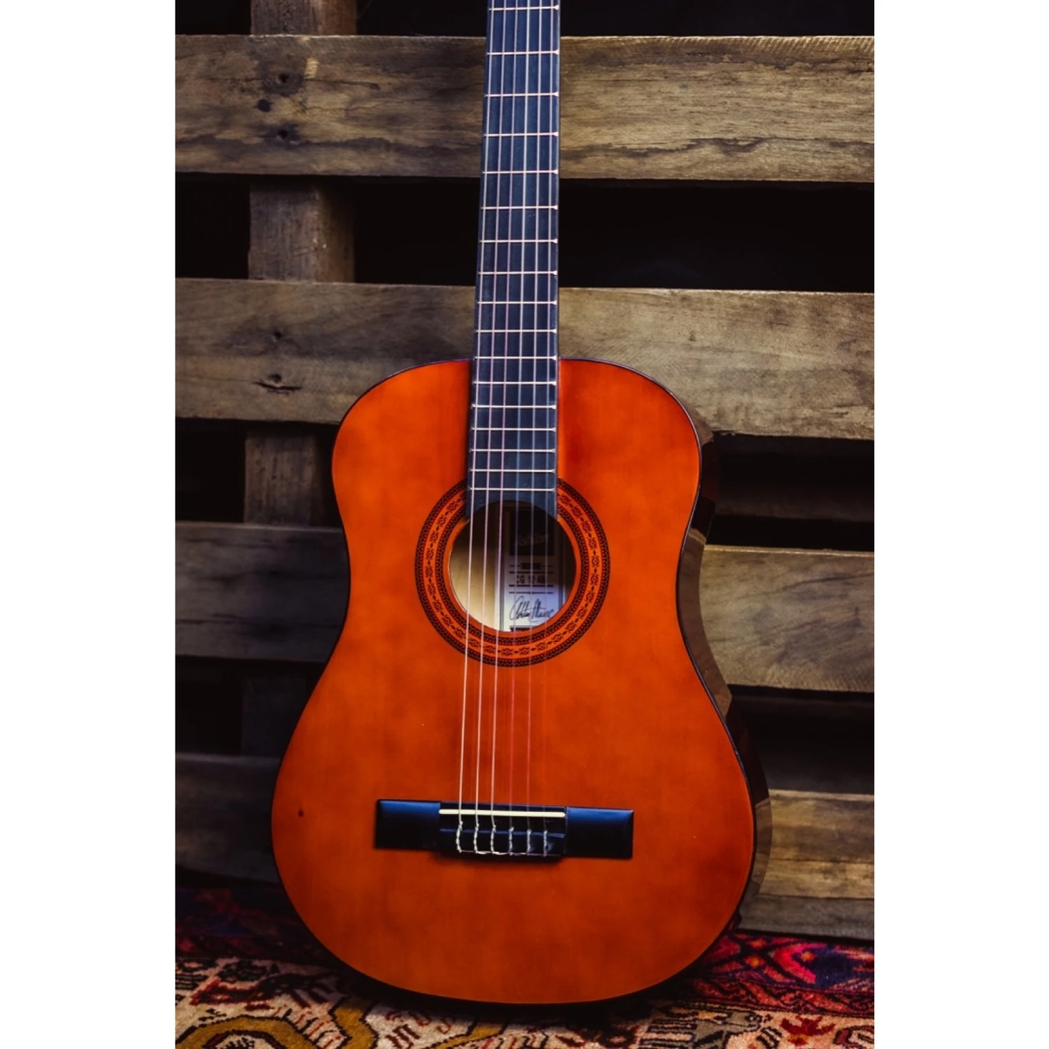 A nylon string (1/4, 1/2, 3/4, 4/4) sized guitar with an easy to play action and a soft nylon string feel which is perfect for beginners. The bottom (lower) three strings are a nylon core with a nickel wrap whilst the other 3 top strings are pure nylon. The strings are a standard tension set again allowing for ease of play.