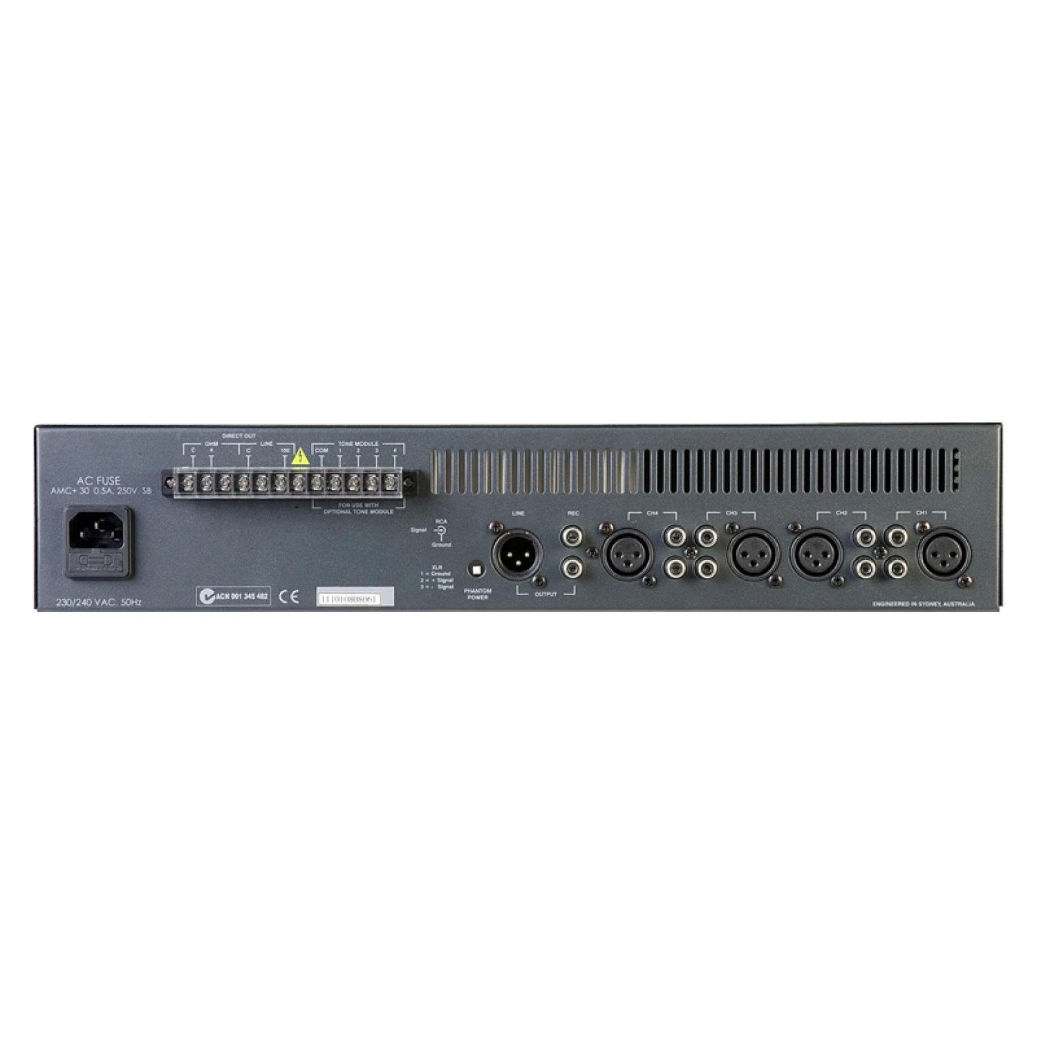 The Australian Monitor AMC+30 delivers high quality audio reinforcement in a low cost 2 rack unit package. The AMC+60 has 4 XLR microphone and dual RCA line inputs with input 1 having priority over inputs 2-4 (defeatable) and global 12VDC phantom power.