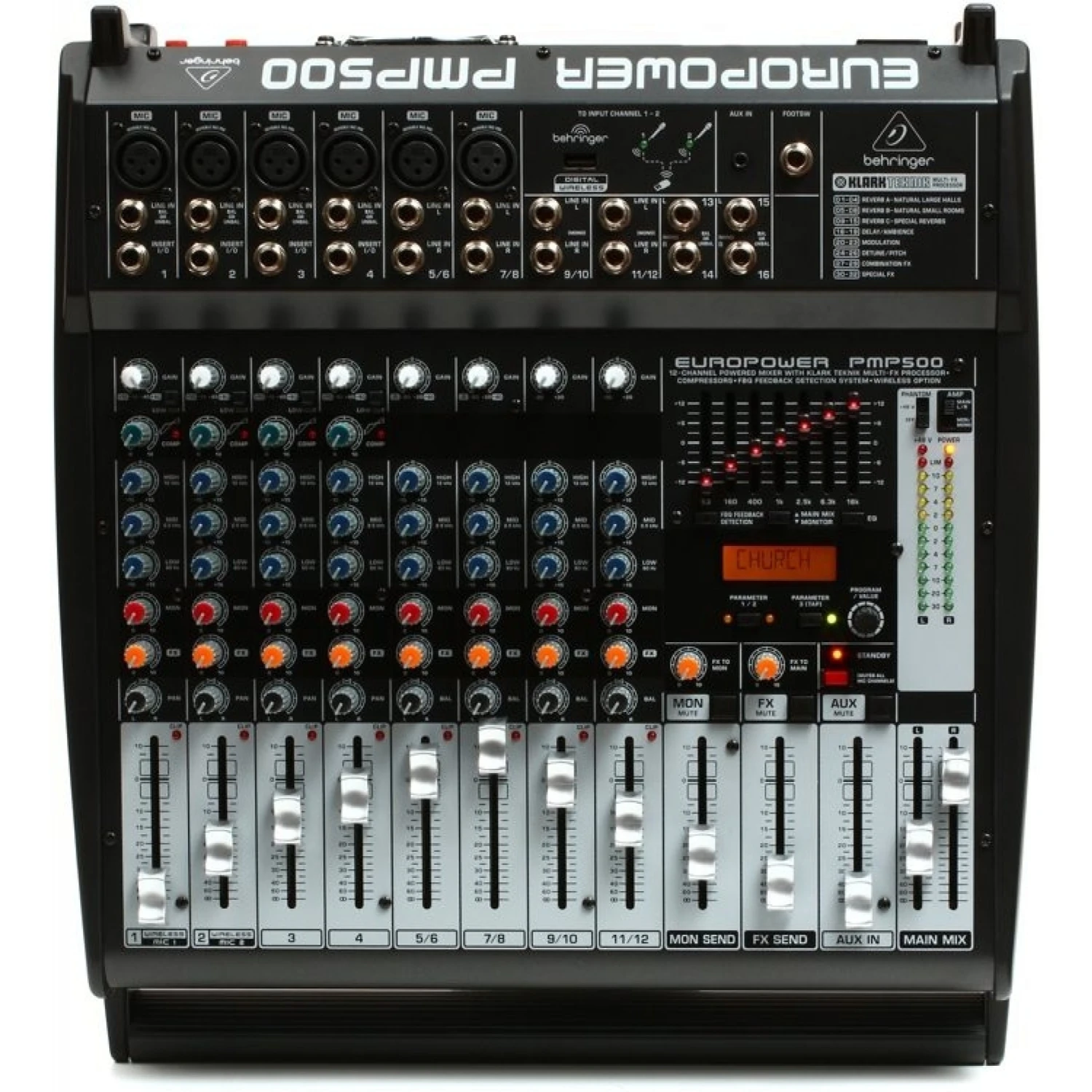- 12-channel powered mixer with EQ, effects, and FBQ feedback detection