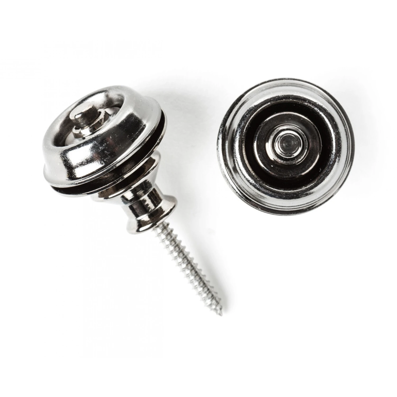Used by the world’s top artists. Now available in a new Vintage Nickel finish. Four ball lock. Wide flange button. Recessed lock plunger. Tested to 800 lbs. Set of 2 units for instrument and strap. Blister packaged. Vintage Nickel.