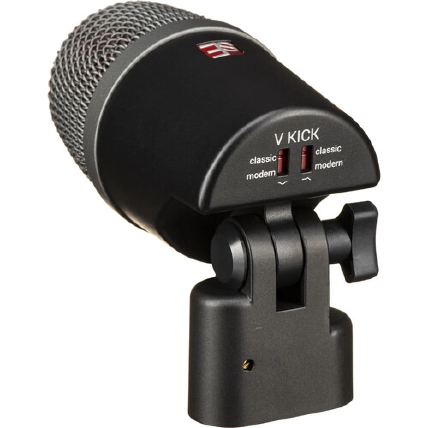 The V KICK is the most compact and versatile drum microphone in its class, intended for use with kick (bass) drums and other sources such as miking bass guitar speaker cabinets, floor toms or other large drums where low-frequency energy is of the utmost importance. Its integrated swivel joint allows for any required mic placement, and its specialized capsule provides a sound character tailored specifically for kick drums, which can be further shaped with the use of two switches on the rear side of the microphone. From warm and classic to modern and aggressive, the V KICK gives you any kick drum sound you need.