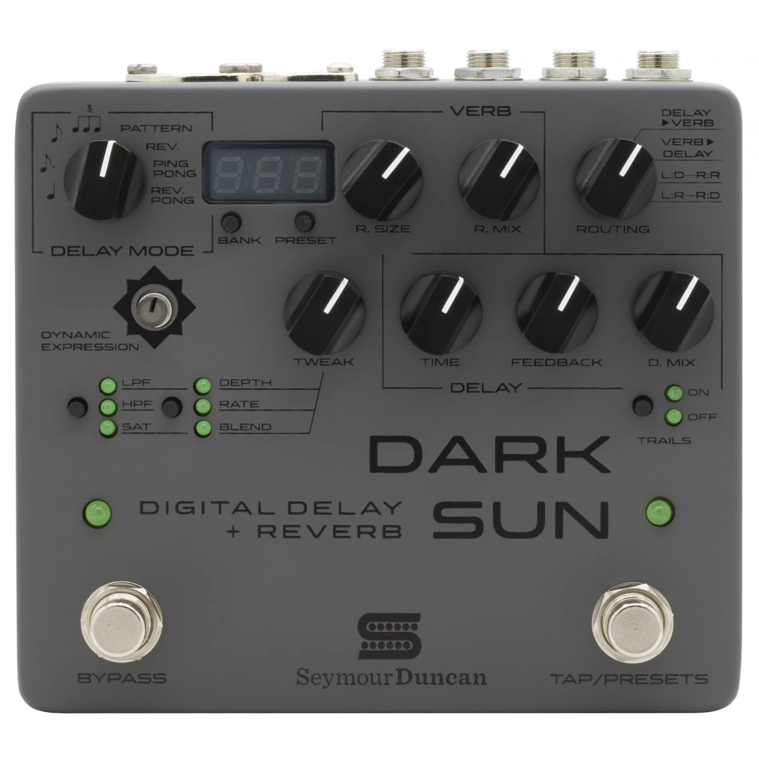 Dark Sun was crafted based on Mark Holcomb’s favorite sounds from the Andromeda Dynamic Delay and the Silver Lake Dynamic Reverb. Dark Sun combines a warm and clean digital delay algorithm with a lush Hall reverb, and the ability to route the two in just about any configuration you could want. And, you can shape the EQ of the effect, add saturation, or lush choral modulation, or use Dynamic Expression to control the mix of the effect with your playing. Mark wanted the ability to change the order of the effects on the fly and assign them to either the left or right channel – so we designed the routing control; a 4-position switch that can create dramatically different sounds depending on how it’s set. Running Delay first means new reverberations are created with each repeat – while putting Reverb first will create a less natural and more dramatic repeat of the reverb trail. Setting Delay and Reverb to the left and right channels allows you to use Dark Sun’s two effects in stereo or as two separate pedals in one. A complement of filters, gain, and modulation round out the feature set. Applied only to the wet signal, they can totally re-shape the character of the effect. Use the Low Pass Filter to soften and warm up the sound, or the High Pass Filter to cut big low-end repeats, allowing you to use high mix settings without overpowering your playing. Saturation adds gain for pleasant lo-fi effects, tape-like saturation, or shoegaze-style distorted repeats. And, the modulation section can be assigned to the delay, the reverb, or both. Dynamic Expression has been distilled to one purpose for this pedal – to control the mix of the effect with your playing. Turn it on and play hard and the mix control is automatically ducked, so the delay and reverb get out of your way. When you play softer or let a note ring out, the mix level will rise again, swelling in ambient trails. Dark Sun has 4 tap divisions available – quarter notes, dotted eighths, eighths, and triplets. You can set the tempo via the tap footswitch, Time control, or MIDI – and the time can be displayed in milliseconds or beats per minute (which you can toggle by holding the trails switch while powering up the device). It is fully MIDI capable, and features a micro-USB port for firmware updates and preset management. Like all Seymour Duncan pedals, Dark Sun was dreamed, designed, and built right here in the US, and features true-bypass switching.