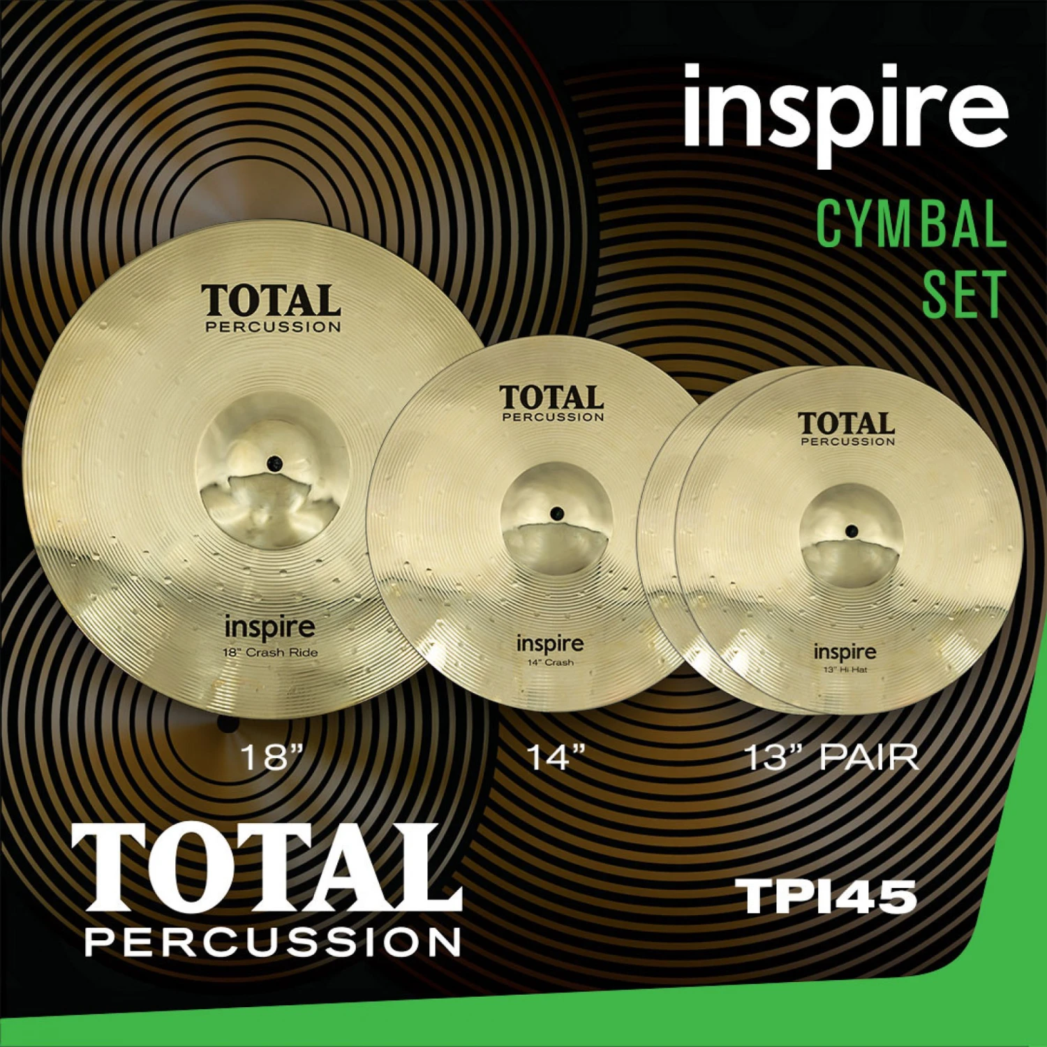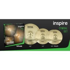 Inspire brass cymbals from Total Percussion have been created to give you the perfect start to your drumming journey.Cymbal Box Set – includes 1pr x TPI13PR Hi-Hats, 1 x TPI14C Crash and 1 x TPI18CR Crash/Ride. Brass Alloy. Full colour display box.