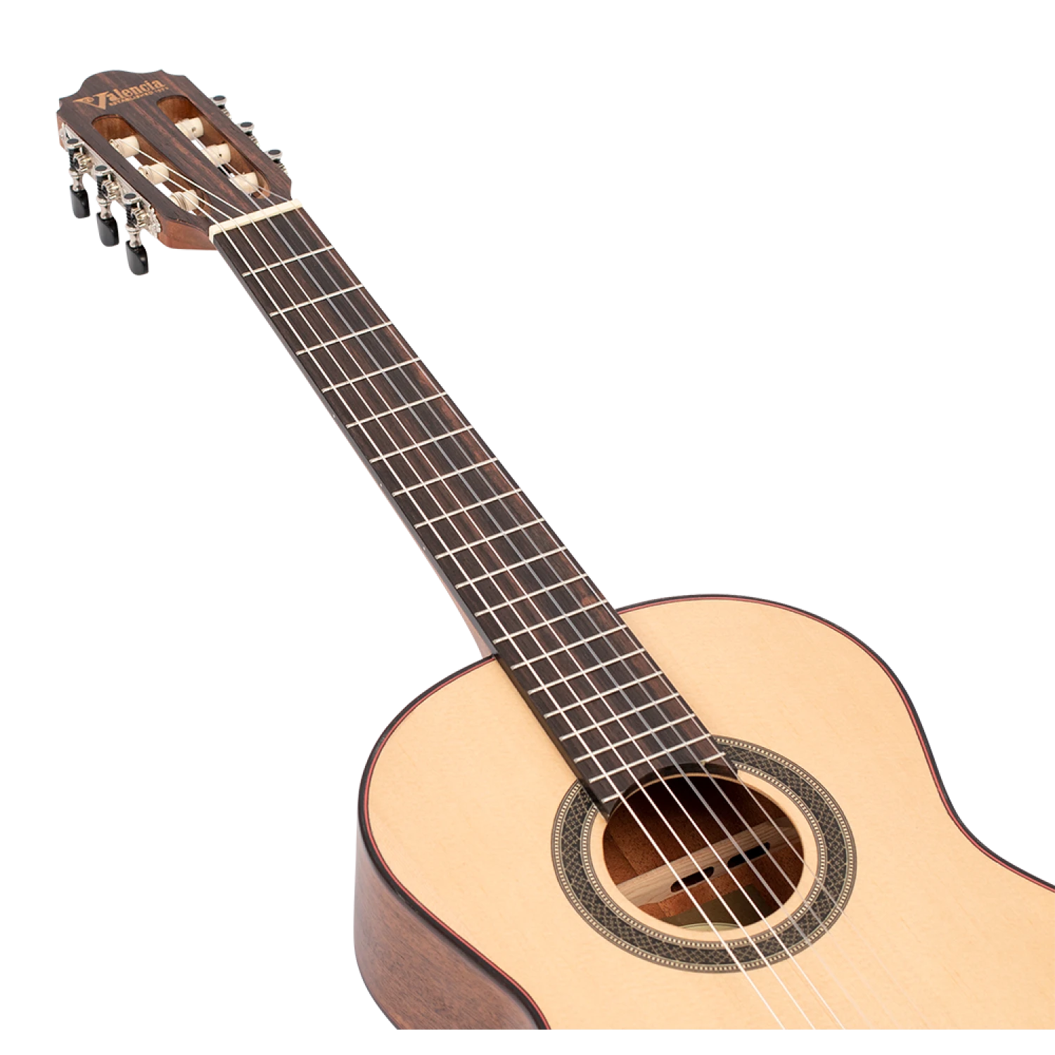 Solid Sitka spruce top with inlaid natural wood mosaic soundhole rosette. Premium mahogany back and sides with arched back. Innovative ToneFlow fan bracing. 4 ply rosewood and maple top binding, 3 ply rosewood and maple side binding. 5 ply rosewood and maple centre back and base strip. Premium mahogany neck with Amara ebony centre reinforcement strip. Amara ebony fingerboard with 19 nickel frets (12 to body). 3 ply Amara ebony multi veneer headstock with engraved Valencia logo. 3 ply Amara ebony multi veneer neck heel end. Amara ebony bridge with wood mosaic decoration. Graph Tech Canada, NuBone XB compensated saddle and nut. Custom diecast machine heads; nickel with satin black buttons. USA strings.