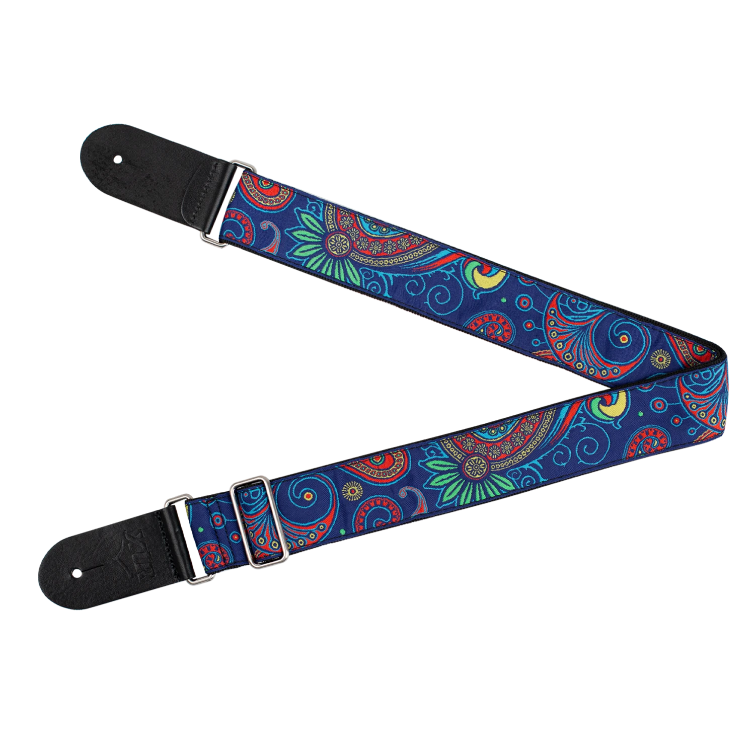 2 inch deluxe woven jacquard poly cotton strap with comfortable, two-layer black poly backing. Premium black leather ends, smooth chrome slider adjustment. Vintage paisley blue.