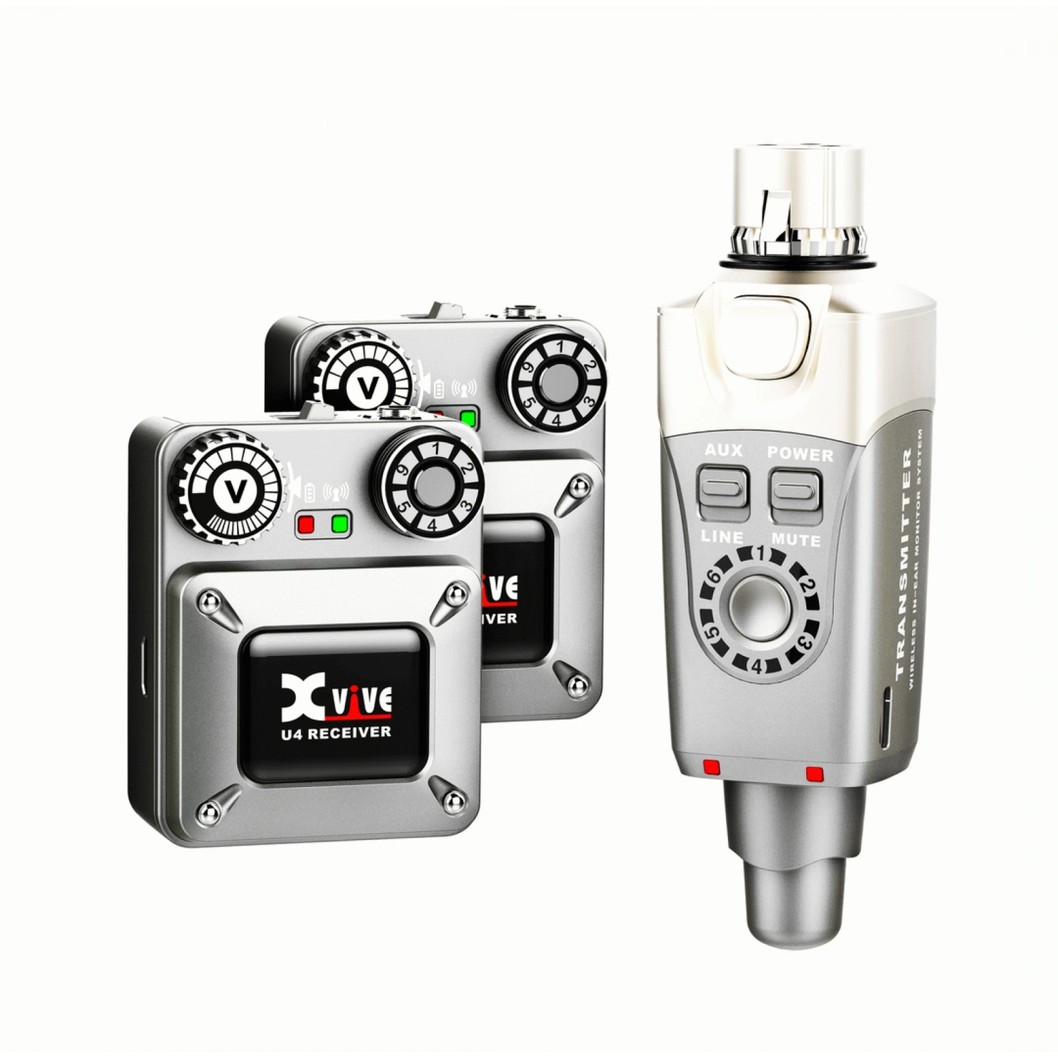 The Xvive U4 wireless In-ear monitor system. One transmitter and two receiver. This mono personal monitor system delivers reliable wireless freedom to every corner of the stage, the high resolution 24-bit/48kbps Audio ensures the clear sound, with ultra-low noise and no artifacts. The system offers plug and play solution, easy to setup and operate. One transmitter can work with many different receivers if they are set to the same channel with the transmitter, which provides the convenience to share the same mix with your band or team.
